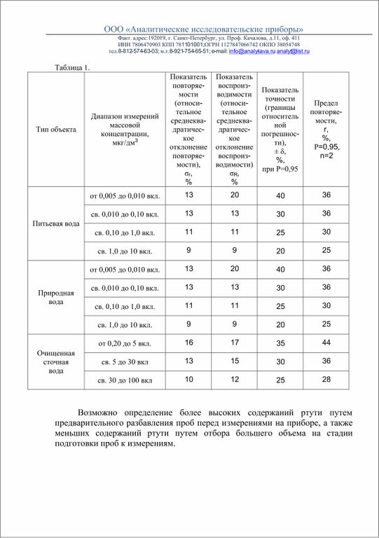 Возможно определение более высоких содержаний ртути путем предварительного разбавления проб перед измерениями на приборе, а также меньших содержаний ртути путем отбора большего объема на стадии подготовки проб к измерениям.